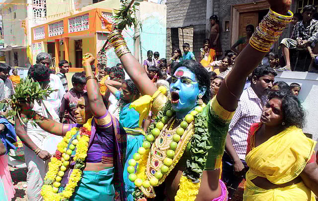People gathered in the cemetery located in the Palar riverbed to conduct rituals. “We gather in the cemetery to give our ‘Nerthikadan’ (thanksgiving) on the auspicious day to our ancestors. We paint our body in different colors and dress like Kali to pay our tribute,” said A Pichaimuthu, of Makkan.