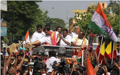 Chief minister V Narayanasamy on a procession celebrating his victory in Nellithope by elections in Puducherry. | (G Pattabiraman | EPS)