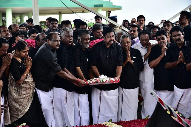 Clad in black shirts, AIADMK coordinator Pannneerselvam and co-coordinator Palaniswami led a silent march of party functionaries including ministers, MPs and MLAs from Anna Salai to late Jayalalithaa's burial site at Marina beach, and paid floral tributes at the bedecked mausoleum.