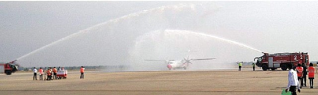 Airport Authority of India officials giving a water salute to the new kid on the block at the Tiruchy International Airport on Monday | Express