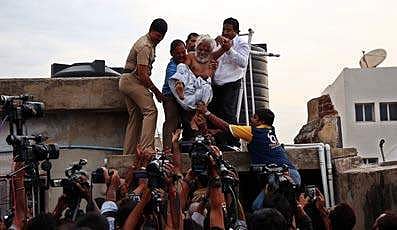 Around 6.25 pm, the police decided to bring ‘Traffic’ Ramaswamy down by force. He further threatened to go naked if he was manhandled. The police brought a ladder and a few people climbed over the loft. Ramaswamy was lifted and brought down forcefully as he wriggled. He was taken inside a room in his office. Reporters were asked to leave the place. When contacted around 8 pm over phone, Ramaswamy said the police had left the place and the gates were unlocked. “I will resume the protest tomorrow again,” he told Express.
