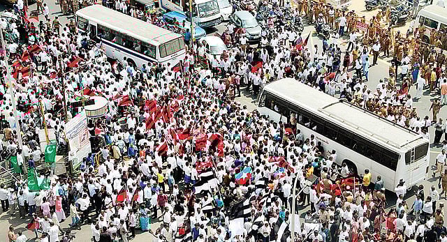 The Anna Statue Junction on Anna Salai was the point of convergence for the protesters. The crowd began to swell as top leaders, including TNC Committee president S Thirunavukkarasar, DK president K Veeramani, VCK leader Thol Thirumavalavan, MDMK deputy general secretary ‘Mallai’ Sathya, Manithaneya Makkal Katchi’s M H Jawahirullah and IUML MLA Abubacker arrived. The Left leaders also joined them.The crowds swelled when DMK working president M K Stalin arrived to lead the road blockade on Anna Salai. His son and film actor Udhayanidhi Stalin also joined the protest.