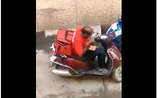 Zomato delivery man eating from tne parcels. (Photo: Screengrab from twitter video.)