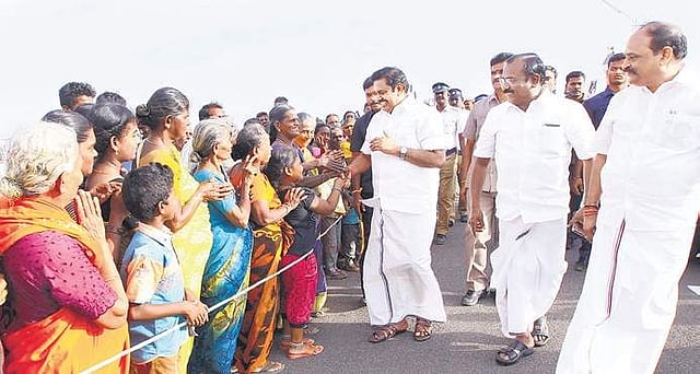 Palaniswami was on his way to Kanniyakumari to participate in MGR centenary function on Saturday. He arrived at Thoothukudi airport on Friday evening and made a quick stopover at KTC Nagar. Palaniswami said that ‘bad political forces’ were dreaming of dethroning the AIADMK. Branding AIADMK as the party of common people, he accused the DMK of becoming the personal fiefdom of Karunanidhi family.