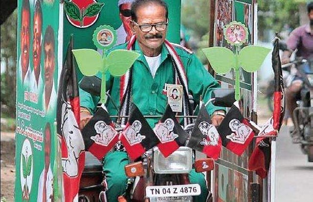 A stauch supporter of AIADMK riding his bike covered with party flags and banners featuring party leaders across the constituency seeking votes for AC Shamugam | Dinesh S