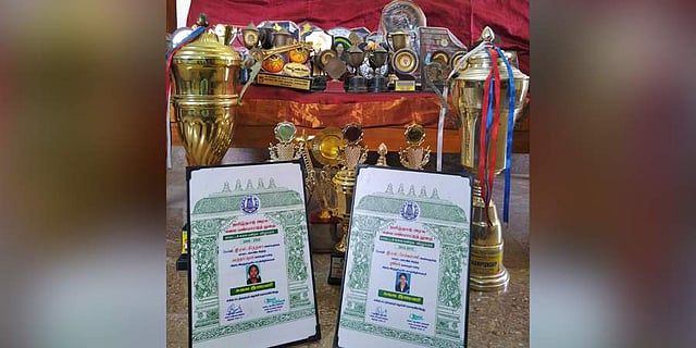 Awards received by Selvarani and Keerthana from various competitions at district and State levels. (Photo | Express)