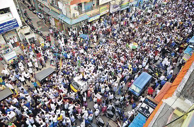 As the crowd kept swelling, one lane of the Wallajah Road was blocked by the protesters for almost three hours. Hundreds of police were deployed on the spot. Addressing the people, speakers touched upon the need for a secular country, ‘to retrieve democracy from clutches of Hindutva’.