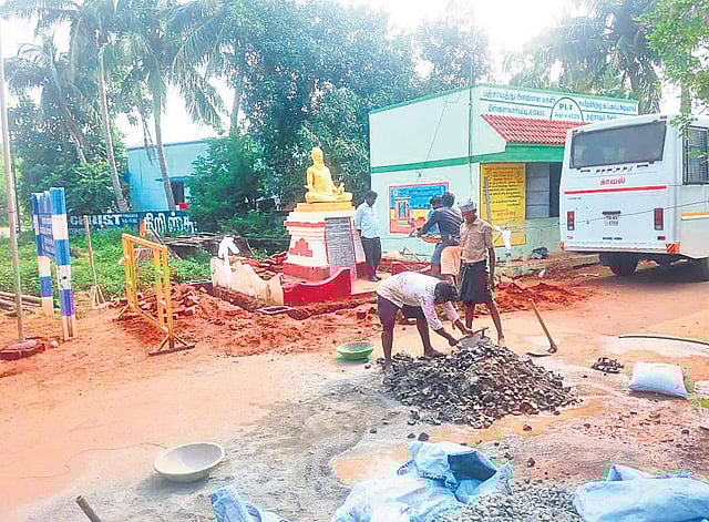 THANJAVUR: An enclosure is being built around the Thiruvalluvar statue, which was desecrated, in Pillayarpatti.