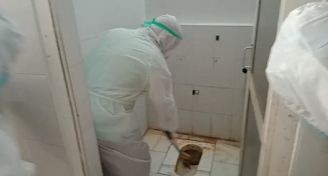 During his inspection of COVID wards at the hospital, the minister received complaints of unclean toilets. Immediately he asked for a cleaning brush and liquid, went inside the toilet and started cleaning it himself.