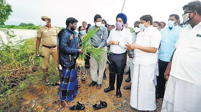 CUDDALORE: Industries Minister MC Sampath on Sunday promised support to farmers in Cuddalore as about 1.12 lakh crops have been damaged due to the floods. Monitoring the relief and rehabilitation work for the flood-affected people, he was accompanied by Collector Chandra Sekhar Sakhamuri, monitoring officer Gagandeep Singh Bedi, Electricity Minister P Thangamani and newly-appointed Law Minister C Ve Shanmugam.