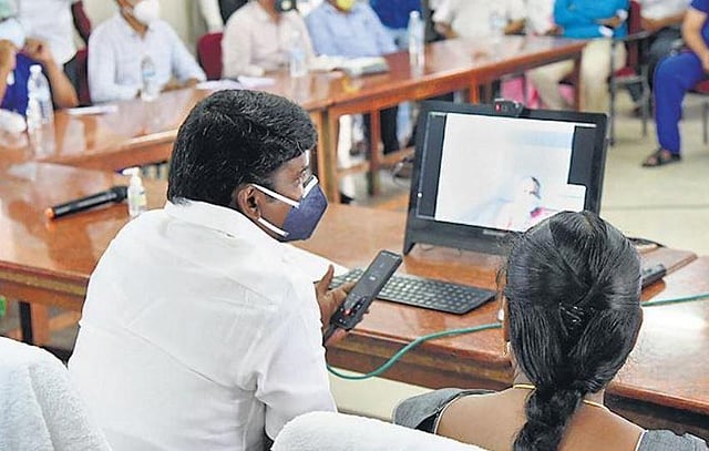 Health Minister C Vijaya Baskar interacts with a Covid-19 patient through video call at Tirunelveli medical college on Saturday | V KARTHIK ALAGU