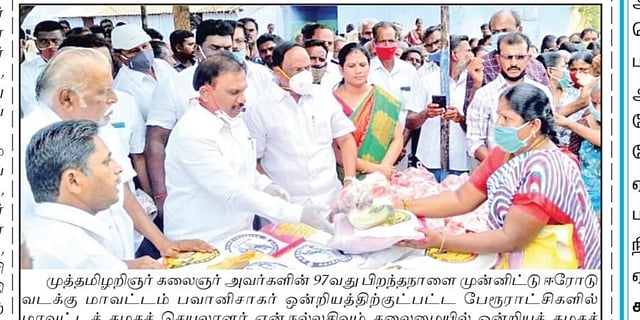 The principal opposition party DMK has been a strong critic of the government in this regard. It has pointed out that social distancing was not followed in events organised by the government and ministers. But how about the events organised by the party? On June 20, the party's newspaper 'Murasoli' carried a photo of an event attended by the former union minister A Raja. The event was to distribute relief materials at Bhavanisagar in Erode district. It is evident from the photo that the spot was so crowded. Though Raja was wearing a mask, it was not covering the nose and mouth. The mask was pulled down to the chin. Others standing next to Raja were not even wearing masks.