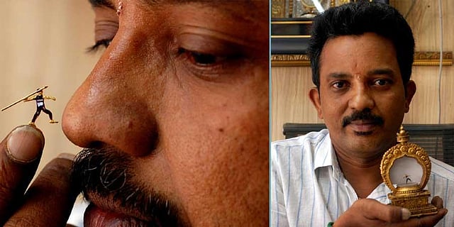 VIRUDHUNAGAR: This 45-year-old man's world is filled with miniatures of gold and silver. Meet Samuthiram (45) of Rajapalayam, a goldsmith and jeweller by profession for 25 years but a miniature artist at heart. A Commerce graduate, Samuthiram started making miniatures after being inspired by his late father who once made a miniature lathe machine in gold. Now, Samuthiram has as many as 15 gold and silver miniatures, including a one gram motorised gold fan, a torchlight that works with batteries and a charkha on his shelf.