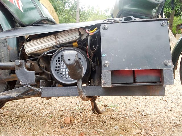 He first bought an old two-wheeler and tried fitting it with a battery. It somewhat worked. To get a better result, he then bought another old two-wheeler in better condition for Rs 2,500. This time, it worked. He's been using it for more than 45 days and says that it is running smoothly, with a mileage of about 45 km. He spent Rs 26,000 and took three months to perfect the vehicle.