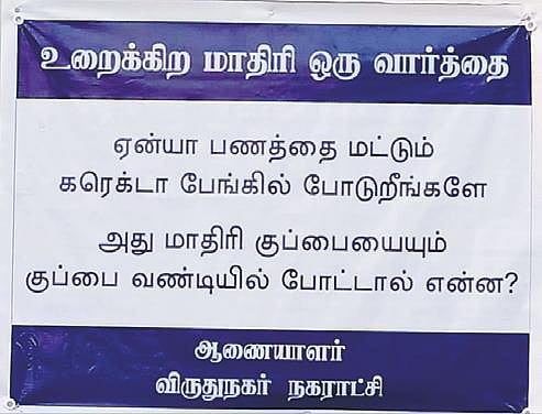 VIRUDHUNAGAR: Posters with the question ‘While you are careful to deposit your money in the bank, why can’t you deposit the garbage on the (garbage) trolley?’, undersigned by the Municipal Commissioner have cropped up in parts of the district on Tuesday.