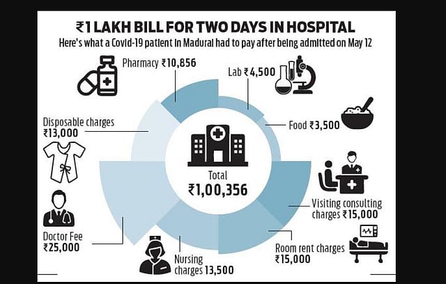 In the first week of May, a threemember family, comprising husband, wife and daughter, was charged Rs 11.5 lakh for Covid treatment by a private hospital in Pudur. The wife and daughter were admitted for two days at the hospital and were together charged about Rs 4.5 lakh. The amount was paid when they were discharged. The husband, however, died after 14 days of treatment.