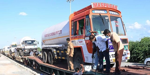 THOOTHUKUDI: Oxygen Express from Rourkela Steel Plant in Odisha reached Thoothukudi's Meelavittan station on Monday, carrying 78.82 Metric Tonnes of liquid oxygen in five tankers rolled onto the wagon. The tanker lorries were rolled off on roads in the presence of Thoothukudi MP Kanimozhi Karunanidhi, Industries Minister Thangam Thennarasu and other ministers Anitha R Radhakrishnan and NP Geetha Jeevan.
