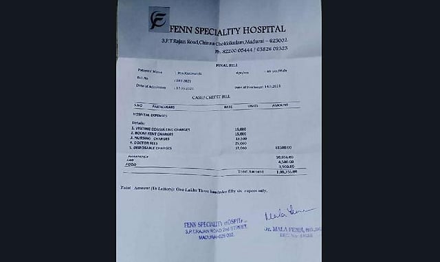According to hospital sources, the patient was tested positive and had lung involvement as per the CT reports. She was admitted for two days at the hospital as mentioned in the bill and was given oxygen support. "As we did not have stock of the antiviral drug Remdesivir, which was used in the treatment of Covid back then, we asked the patients' family to purchase it from outside. They urged us to procure it for her.