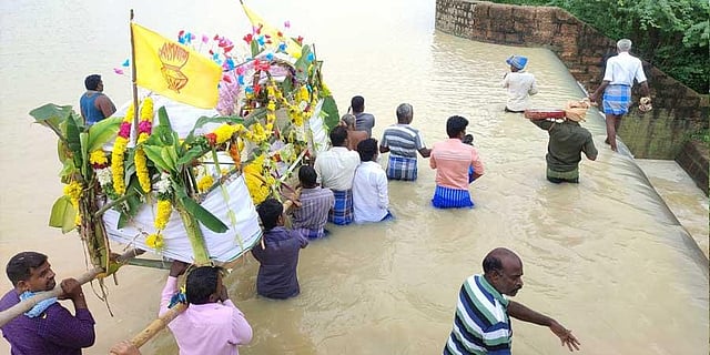 ARIYALUR: It was a sad day for residents of Kazhuvanthondi village in the district on Friday, when they had to carry a couple of bodies to a graveyard in hip-deep water owing to an overflowing lake, once again. This, the villagers said, happens every time it rains heavily, causing an overflow in the lake spread across 65 acres.