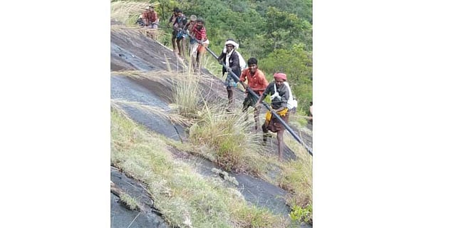 The workers along with forest staff carried the pipe rolls through hilly terrain walking more than 3 km, sources said.