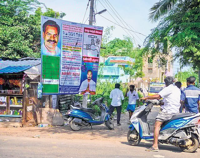 In Ayakolathur panchayat of Sriperumbudur union, huge flex banners publicising candidates (belonging to DMK, Congress, and VCK) were placed in public in violation of model code of conduct rules. When asked, a police officer said such banners crop up immediately and at different places even after removing them.