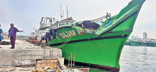 Another fishermen on the ill-fated boat, A Rooben Rose (36), said the ship had only a few lights on. “After the collision, most of the lights of the ship started burning. The impact was so strong that our boat nearly capsized,” he said, adding after the accident the cargo vessel did not stop. The son of the owner of the boat, R Anto Siju, said they have lodged a complaint with the Colachel Marine Police.