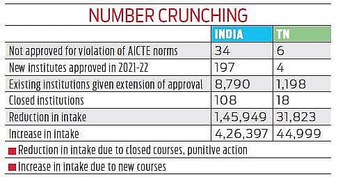 The AICTE allowed 108 technical institutions, including 18 in TN, to wind up operations, after the latter felt it was not viable for them to function. Further, four new institutions in TN (two MBA colleges, one MCA college, and one offering MBA and MCA) have been allowed to open.