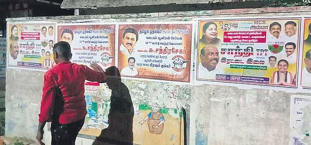 Support (him) and vote for pressure cooker,” reads the posters pasted by Chandrasekar’s supporters across his ward. Only images of Stalin and Chandrasekar decorate the poster, and AMMK leaders, including party general secretary TTV Dhinakaran, find no mention on it.
