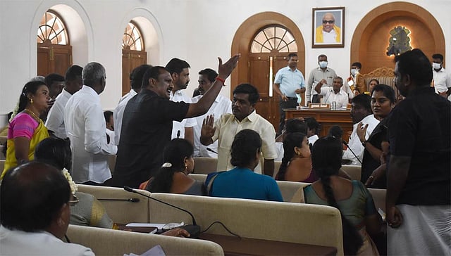 COIMBATORE: Commotion and heated arguments between AIADMK and DMK councillors marked the first meeting of the Corporation council on Monday. Mayor Kalpana Anandakumar presided over the meeting with CCMC Commissioner Raja Gopal Sunkara, Deputy Mayor R Vetriselvan and Deputy Commissioner Dr M Sharmila attending it.