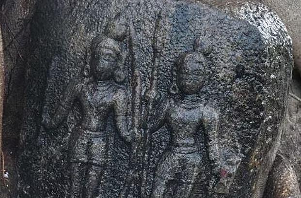 The stone measures 50 cm in height and 40 cm in width. It depicts a hero holding a bow and arrow, while another is found holding a large spear. Both wear under garment-like dress which covers the middle section of their body. There were no inscriptions in the stone, he said.