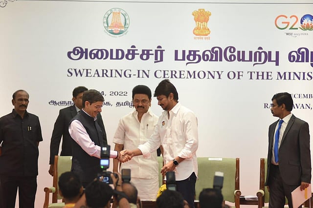 Earlier, Udhayanidhi Stalin was sworn in as Minister at a simple function at Raj Bhavan. Governor RN Ravi administered the oath of office and secrecy at 9.35 am and the entire swearing-in event was over in nine minutes. After taking the oath, Udhayanidhi presented a bouquet to the Governor and later touched the feet of his father MK Stalin.