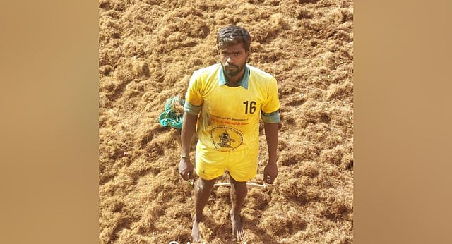 During the fifth round, when he attempted to jump onto the back of the raging bull that pounced through the Palamedi Vadivasal, he was gored in the abdomen and tossed onto the ground by the bull.