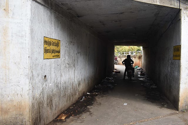 On Saturday around 11 pm, a gang tried to waylay and threaten K Praveenkumar (36), who works in a food delivery service. Sensing the risk, he quickly took a turn and decided to cross the area with another route. “When I tried to enter the stretch which connects two underpasses just after the entrance, a group of men, who were consuming liquor, tried to waylay me. The entire stretch which goes for at least 100 meters inside the underpass looks like a hide-out. I got scared after seeing those men standing there,” he said.