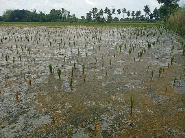"I am cultivating long duration crop CR-1009 on around four acres for four weeks. A brief downpour rejuvenated the crops, but not enough to save them from algal growth and salinity. We are praying for more rainfall," said K Senthil (47) of Semangalam village in Sembanarkoil block.