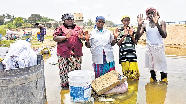 TIRUCHY : It’s a hot summer day in Alagiripuram by the banks of Kollidam river in Tiruchy. Standing knee-deep in water, M Ganesan rinses a cloth, wrings it and throws it on to a pile of damp clothes kept in a bucket near him. Hundreds of dhobis like M Ganesan, who live in Alagiripuram are battling a unique challenge.