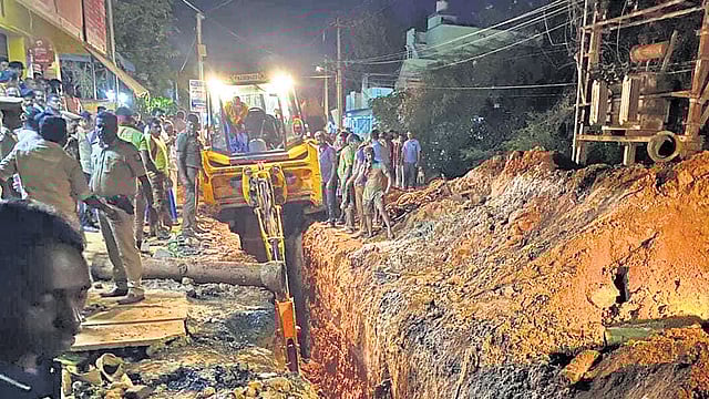 Following complaints of leakage in the UGD pipe network in Pookkara Vilar Road at Jagannathan Nagar, the trench was dug up to lay new pipes. On Monday evening, four engaged in the work at the spot decided to call it a day and resume labour the next morning. While two came out, the soil heaped on the side gave in when the remaining workers were climbing up, Mayor S Ramanathan told TNIE.