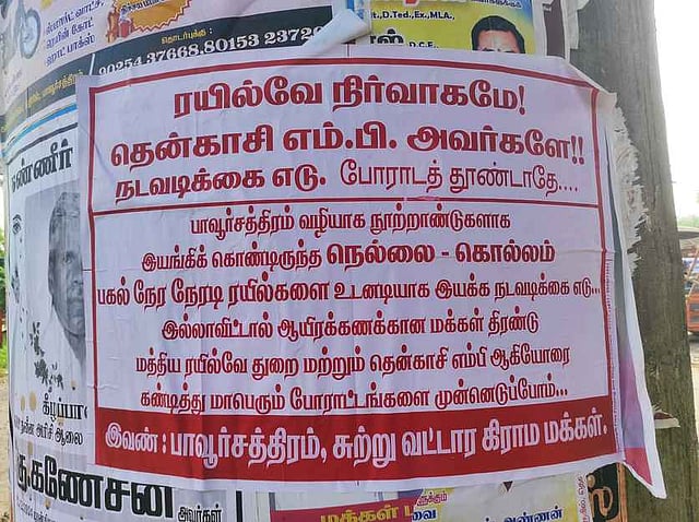 TENKASI: Seeking the restoration of direct train services on the Tirunelveli-Pavoorchatram-Tenkasi-Kollam route, posters were put up across Pavoorchatram and neighbouring villages in protest against the Southern Railways and Tenkasi MP Rani Srikumar on Sunday.
