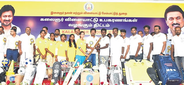 According to an official release, the yellow in the logo symbolises energy and enthusiasm for sports and blue stood for momentum and freedom. Udhayanidhi also distributed Kalaignar sports kits at the event which was held in Tiruppur. Udhayanidhi launched the distribution of 410 sports kits, each containing 33 types of sports equipment including for cricket, volleyball, football and silambam for 265 village panchayats in Tiruppur.