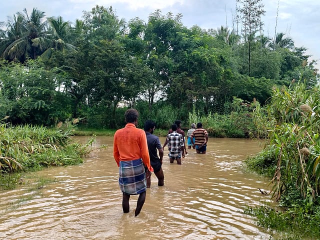 The Marudaiyaru River flows between Gudalur and Koothur villages. Gudalur residents cross the river to go to their agricultural lands, cooperative bank and veterinary hospital. Students cross the river to go to schools. When there is no water, they cross the dry riverbed on foot or on two-wheelers.