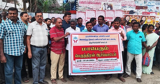 CHENNAI: Members of Federation of Integrated Education Department employees staged protests across various district headquarters, demanding the release of their pending salaries. A section of employees also wore black dresses to work to protest the delay.