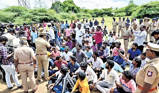 The police arrested 10 persons from their houses in Sunguvarchatram on Tuesday midnight, and later on Wednesday, detained 616 others who continued to protest even after police dismantled the temporary shed from where they had been protesting for the last month.