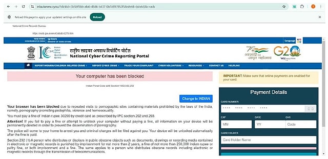 CHENNAI: The Cyber Patrolling Team of Cyber Crime Wing, Tamil Nadu has identified a website posing as the National Cybercrime Reporting Portal (NCRP). The content of the website shows “YOUR COMPUTER HAS BEEN BLOCKED” and it has a payment details column which can capture sensitive financial information such as “Card details, Expiry Date and CVV”, an official release by the wing said on Wednesday.