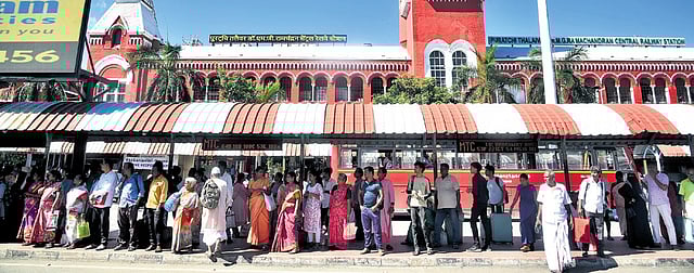 When TNIE visited the spot, over 50 people, including office-goers, outstation visitors, and patients returning from Rajiv Gandhi Government General Hospital, were on their feet awaiting buses.