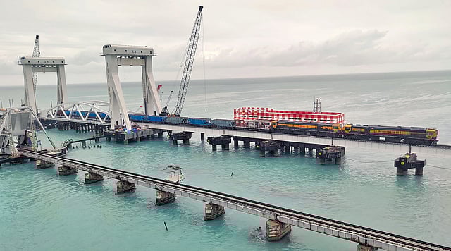 The new railway bridge, spanning 2.05 kilometres across the Palk Strait in the Bay of Bengal, links Rameswaram Island to the mainland. Official sources said the new bridge is the country’s first vertical lift railway sea bridge and designed to accommodate high-speed trains. The bridge was constructed by the Rail Vikas Nigam Limited (RVNL), the engineering arm of Indian Railways, at a cost of `535 crore.