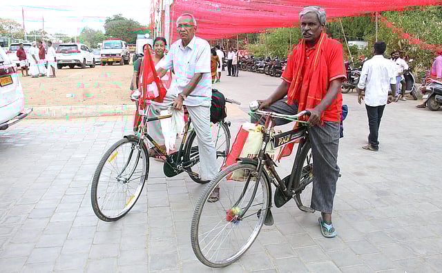 MADURAI: The saying that age is just a number was proven right by Challa Venkataiah (72) and C Kuppusamy (58), who travelled by cycle for 510 km from Tirupati in Telangana to the CPM's 24th party congress at Tamukkam ground in Madurai on Saturday evening. The delegates of CPM received the duo with a grand welcome.
