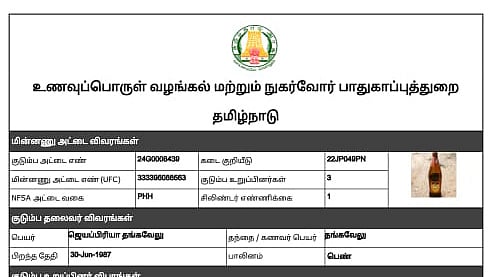 MADURAI: A family from Chinnapulampatti village in Peraiyur taluk was shocked to see the image of a liquor bottle on their e-ration card. However, the officials assured that this problem will be rectified within a day.