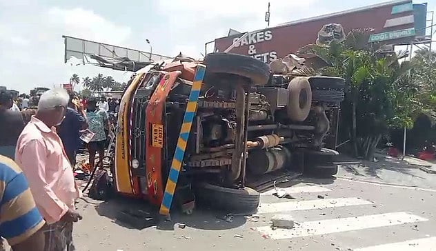 According to sources, the accident occurred around 11 am on Saturday when a truck carrying cardboard boxes was travelling from Palladam to Udumalpet. The driver Suresh (40) was speeding on the four-lane highway and swerved slightly to the left to avoid hitting another vehicle. While his left wheels remained on the smooth road, the right wheels rolled onto the thick rumble strips, causing him to lose control of the vehicle. The truck struck a car parked along the road and dragged it for a few metres before coming to a stop after hitting the front of a bakery. A customer Lakshmi (64) sustained leg injuries from a flying stone during the accident.