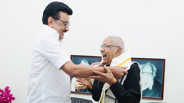 On the occasion of Dravidar Kazhagam leader K Veeramani's 93rd birthday, Tamil Nadu Chief Minister MK Stalin visited his residence and wished him well.
