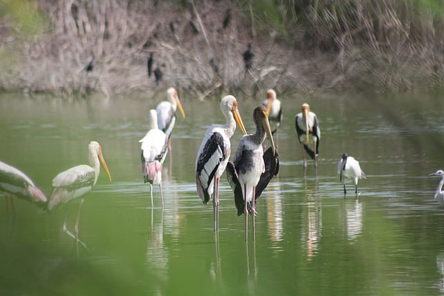 Painted storks were spotted nesting in the Thirumullaival mangroves in Mayiladuthurai.  (Photo | Express)