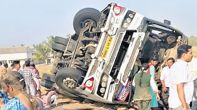 “At Samrajpalayam near Pallagoundenpalayam, the driver tried to overtake a goods truck but lost control over the vehicle and veered off down a slope on the road. When he tried to get back on to the road, the bus overturned,” a police officer said.